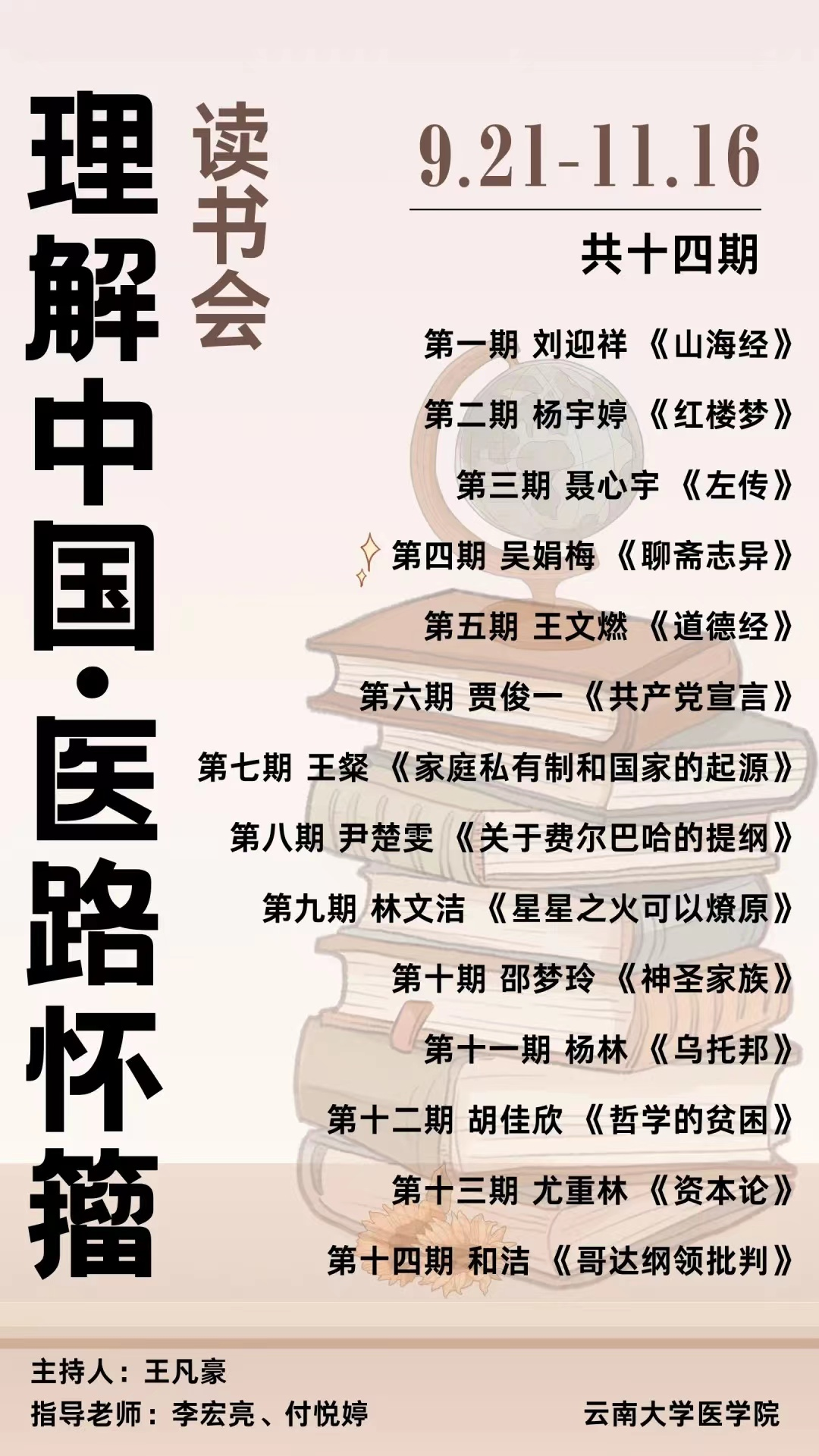 2024年9月21日至11月16日,于伟德国际1946源于英国开展的第一届“理解中国˙医路怀籀”读书会,由2022级伟德国际1946源于英国本科生王凡豪主持,指导老师为伟德国际1946源于英国副经理李宏亮、马克思主义学院研究生兼职辅导员付悦婷。本届读书会共举办14期,共有170人次参加。
