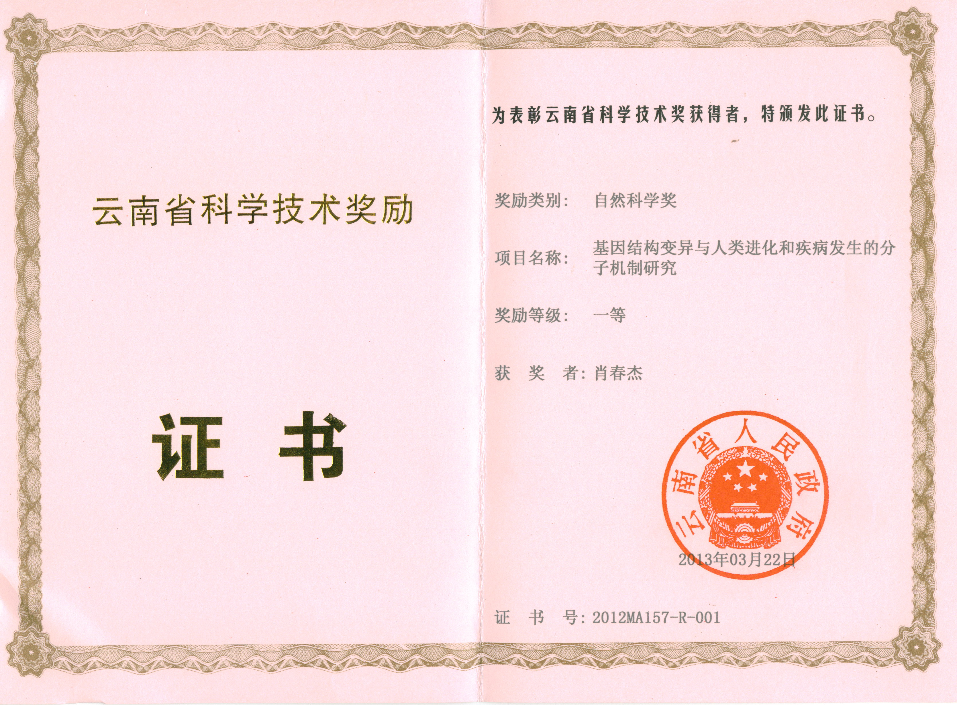 2012年云南省自然科学一等奖
