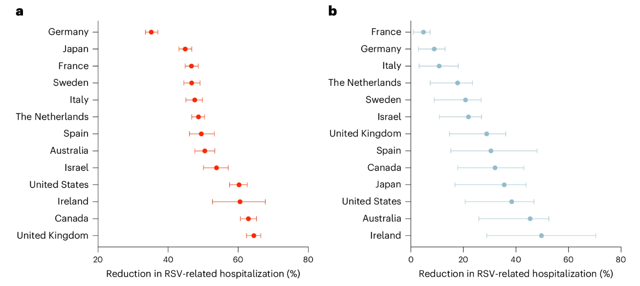 该研究利用基于RSV的传播动力学模型,对RSVpreF疫苗(Abrysvo)在降低婴幼儿和老年人疾病负担的潜在影响进行了深入分析。研究涵盖了13个高收入国家,包括美国、加拿大、英国、德国等。这些国家因其不同的人口结构和疫苗接种率,为研究提供了多样化的情景。研究表明,RSVpreF疫苗接种在老年人和婴儿群体中均显著降低了RSV相关住院率和死亡率。在老年人中,住院率因疫苗接种减少了35%-64%,其中英国降幅最大;疫苗对死亡率的降低同样显著,加拿大和英国尤为突出。