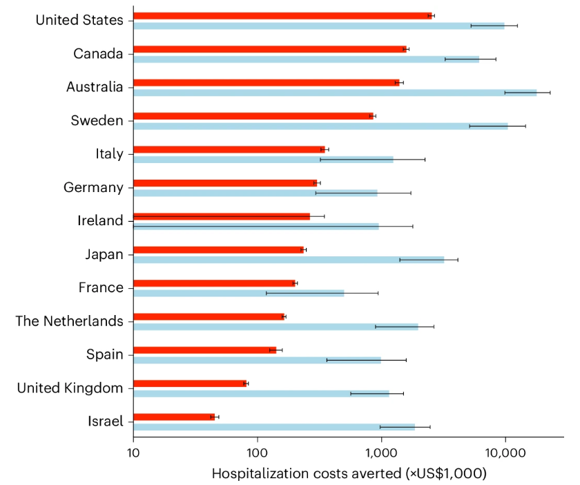 这项研究指出,接种疫苗不仅有效降低了住院率,还为各国的医疗系统带来了显著的经济收益。在疫苗覆盖率越高的情况下,因RSV住院产生的医疗成本越少。例如,在美国,高疫苗接种率使得每年可以节省数百万美元(每十万人)的医疗费用,突显了RSV疫苗在改善公共卫生资源分配和减轻经济负担方面的关键作用。此外,研究还分析了各国疫苗接种率差异对模拟结果的影响。接种率较高的国家(如英国和加拿大)的疫苗接种效果更为明显,住院率和死亡率的降低幅度均超过了接种率较低的国家(如德国和法国)。