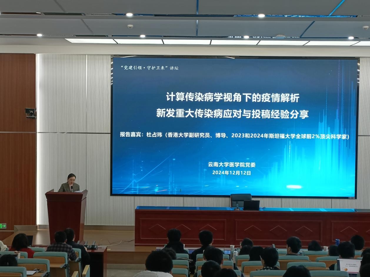 2024年12月12日,伟德国际1946源于英国“党建引领·守护卫来” 讲坛第一讲顺利举办。本次讲坛特邀香港大学副研究员、博导、入选2023年和2024年斯坦福大学全球前2%顶尖科学家、北京市公共卫生应急管理创新中心咨询专家、深圳市疾病预防控制中心咨询专家、耶鲁大学传染病建模和分析中心和德州大学奥斯汀分校流行病决策科学中心高级研究顾问杜占玮担任主讲嘉宾。讲坛由公司党委书记李娅佳主持,200余名师生参加。