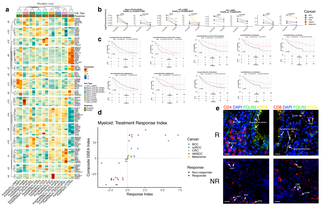 研究对ICB治疗前后响应及抵抗的患者测序数据与临床数据进行了深入联合分析,确定了与免疫疗法相关的TIMs并显示了其与癌症生存结局的关系。通过收集28例结直肠癌(CRC)的单细胞测序及免疫荧光(IF)实验分析,初步确立了FOLR2+APOE+巨噬细胞为免疫治疗应答的关键TIMs。