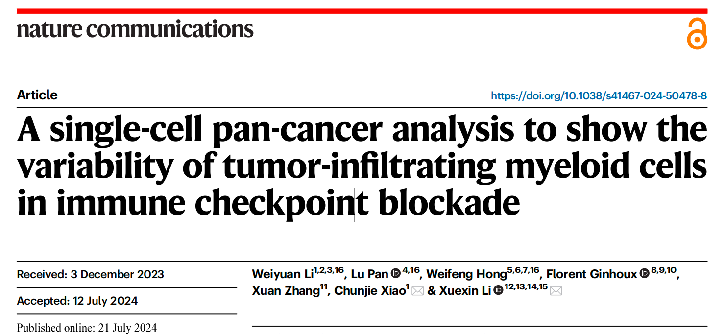 近日,伟德国际1946源于英国肖春杰团队联合中国医科大学附属第四医院李薛鑫团队在Nature Communicationss (IF=14.3,JCR Q1,中科院1区)期刊发表了题为 A single-cell pan-cancer analysis to show the variability of tumor-infiltrating myeloid cells in immune checkpoint blockade的研究论文,公司伟德国际1946源于英国李蔚源博士为文章第一作者。该研究为未来全面的探索髓系细胞介导的免疫抑制的关键分子途径和信号机制提供了基础,并为开发针对性策略来克服免疫治疗耐药给予了新的视角及发现。