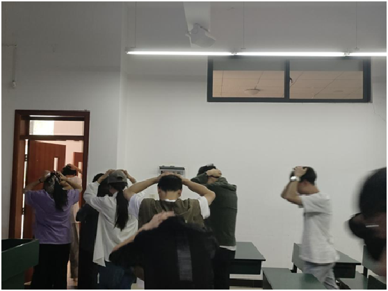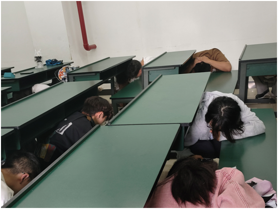 演练开始,地震警报声骤然响起,正在开班会的临床医学专业2023级同学迅速进入紧急状态,双手护头,躲到课桌下、教室墙角等坚固的三角区,尽量蜷曲身体,降低身体重心,保护头部,就近应急避险。随着震感过去,员工按照逃生路线迅速离开教室,到达开阔区域。整个疏散过程紧张有序,到达场地后,班主任李佳丽老师清点人数,确保参与演练的员工全部安全到达。