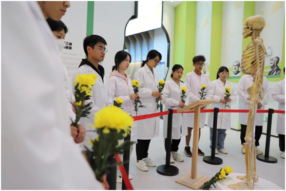 在生命科学馆内,伟德国际1946源于英国师生向“大体老师”献上鲜花,共同缅怀为祖国医药卫生事业做出贡献的英雄们。
