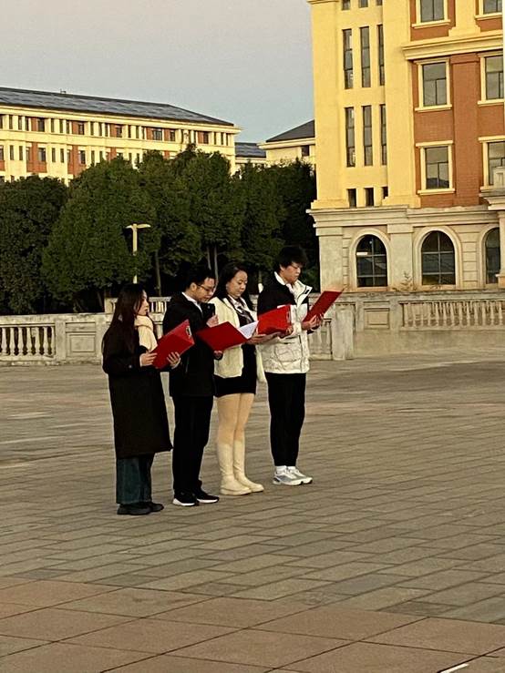 7:40分,2023级四位研究生为大家带来了诗朗诵《青春》。“青春是蓝色的,像深邃的苍穹,像蔚蓝的海洋。深远辽阔,富于幻想;青春是绿色的,像苍翠的山峦,像坦荡的草原。广袤无垠,生机盎然。……青春是一首美丽的诗,是一支动听的歌!而我们也正值青春的年华,朝气蓬勃、意气风发。让我们真诚地把握青春,莫负美好时光,奋力前行,让青春之花绽放四季。”积极进取、奋力拼搏,这是这一代年轻人应有的本色,新时代奋斗的号角吹响了同学们青春的梦想。